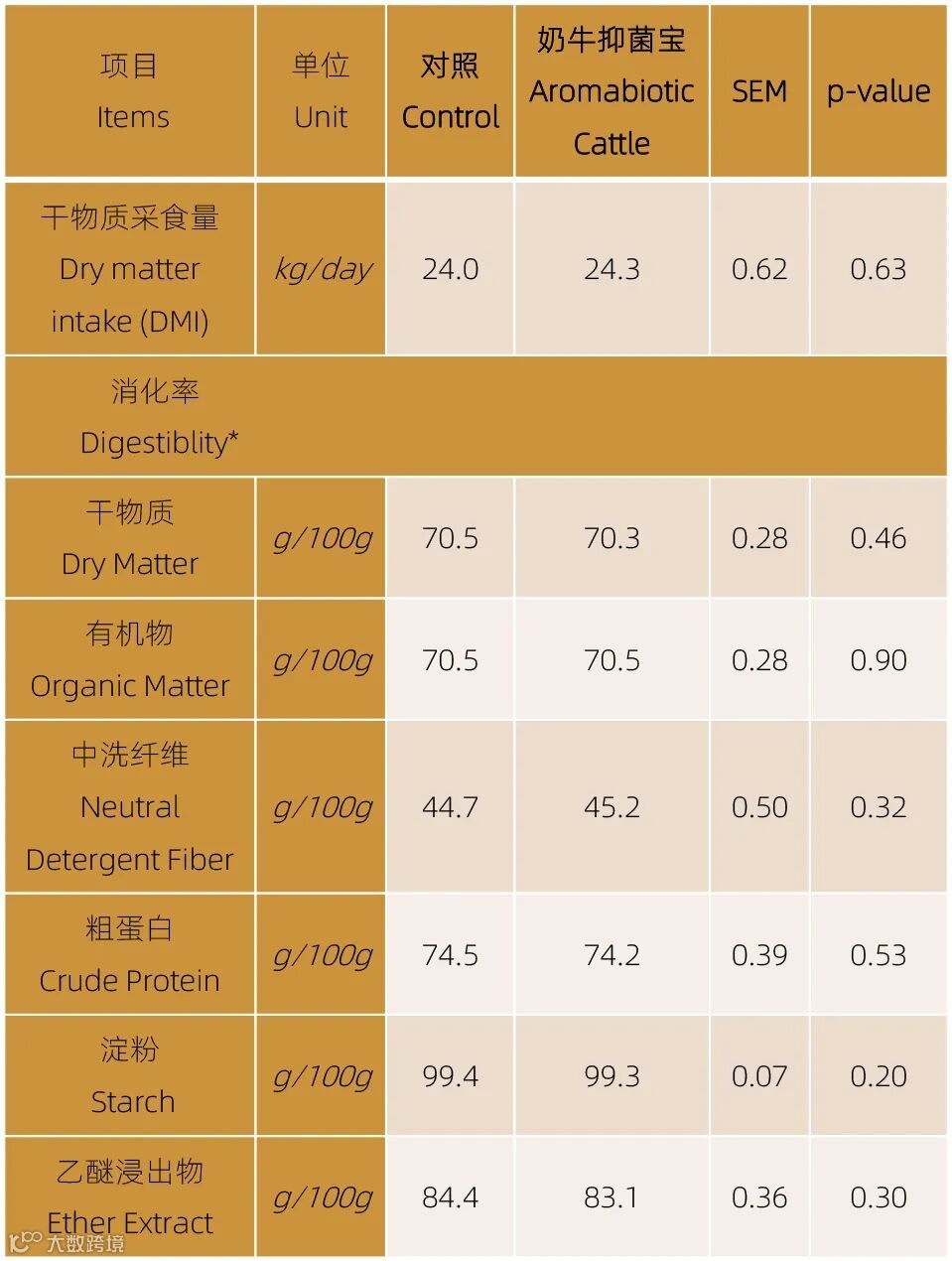 如表2所示:日粮中添加奶牛抑菌宝对干物质采食量及营养物质消化率均无负面影响。