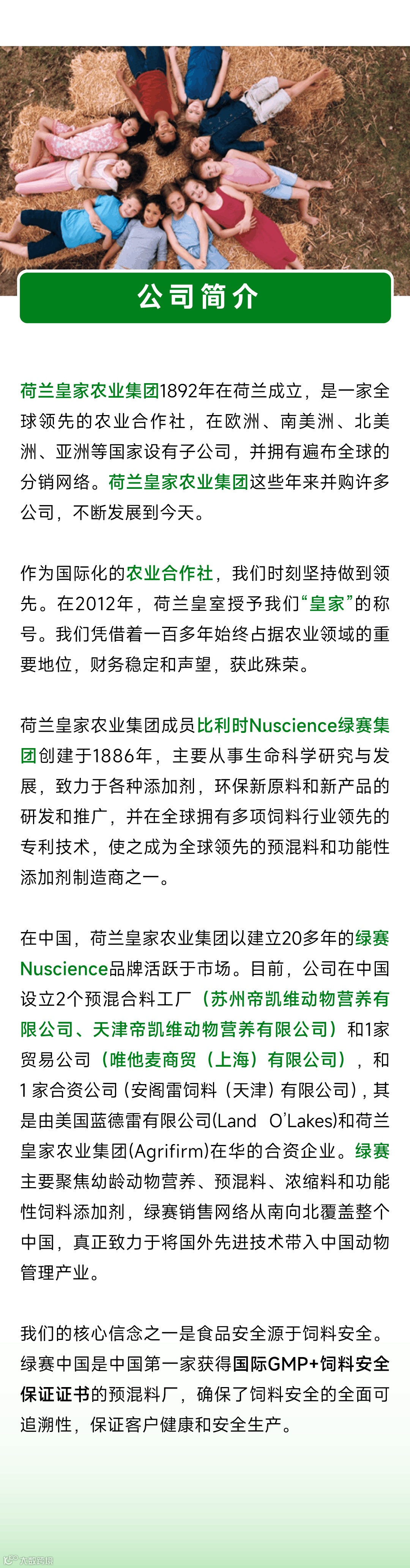 荷兰皇家农业集团(1892年成立)以建立20多年的绿赛Nuscience品牌活跃于中国市场;绿赛是中国首家所有工厂均获得国际GMP+饲料安全保证体系认证的集团