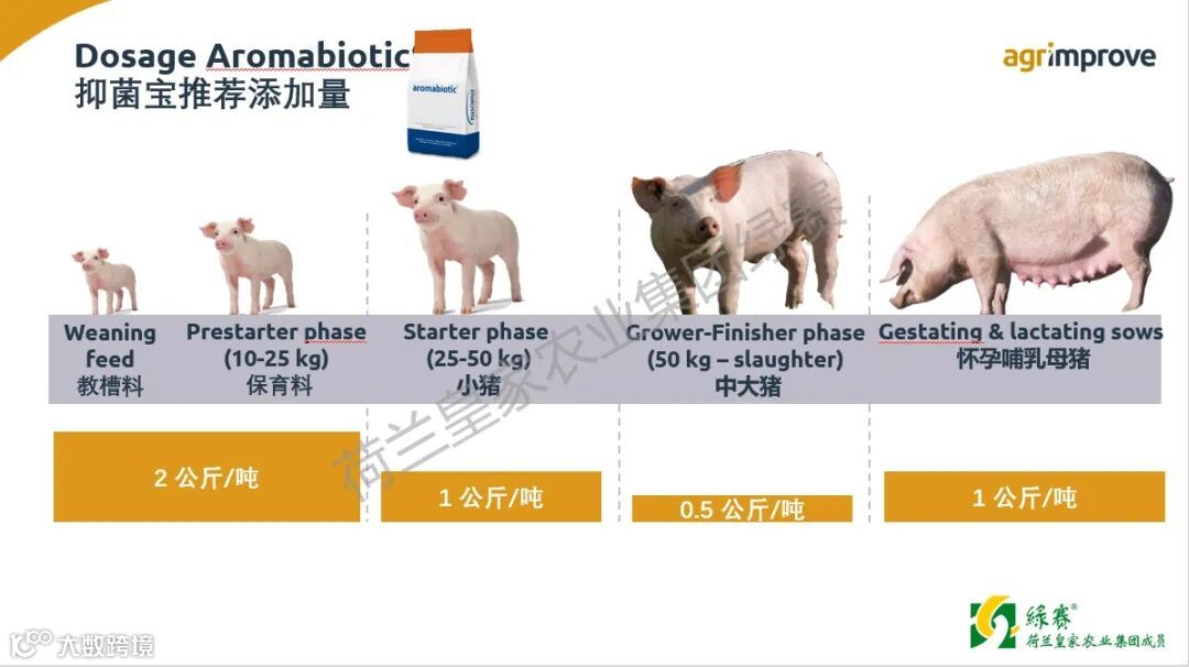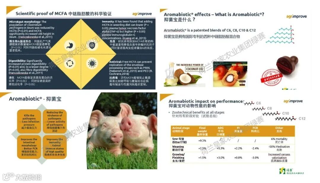 绿赛集团作为MCFA在动物领域应用的全球开创者进行了大量的研究,针对不同动物的替抗需求,通过研发MCFA最佳配比,绿赛集团已有对应不同动物包括猪、鸡、牛、水产等的成熟产品。研究结果表明,通过向饲料中添加4种MCFA混合物(抑菌宝),可显著地降低猪、鸡消化道内病原菌的数量,而且若长期饲喂则可减少沙门氏菌等的感染,对母猪也可起到降低应激,减少乳房炎、子宫炎和无乳综合征(MMA)等疾病发病率的作用。因此,使用抑菌宝能有效的减少动物生产过程中抗生素使用。