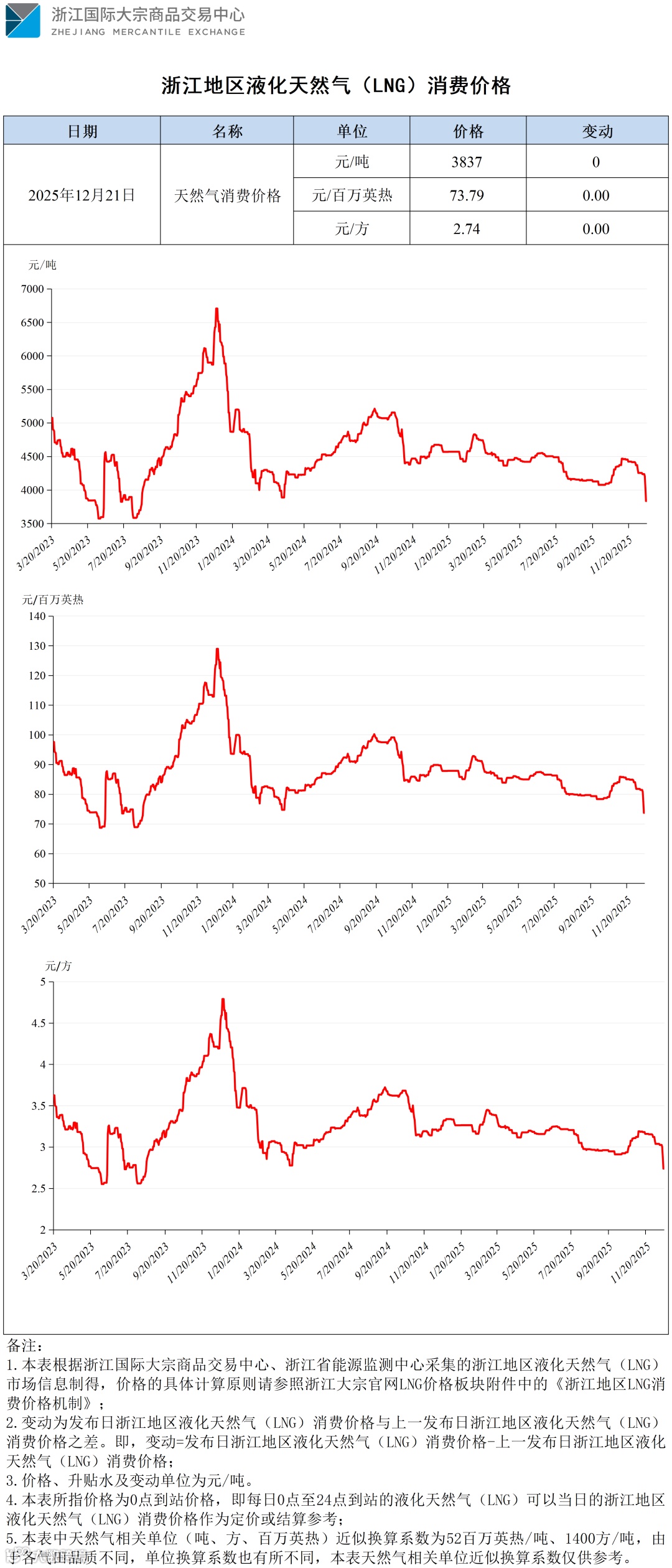 【价格指数】浙江地区液化天然气(LNG)消费价格(20251220-20251221)