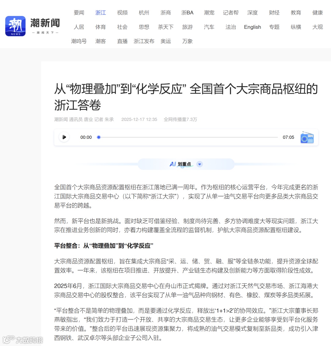 全国首个大宗商品资源配置枢纽在浙江落地已满一周年。浙江大宗作为枢纽建设的核心运营平台,聚焦 “舟山价格” 破局、全产业链联盟共建等创新举措,交出了一份责任答卷。从完成省内两家现货交易场所资源整合的“物理叠加”到1+1大于2的“化学反应”,实现了从单一油气交易平台向更多品类大宗商品交易平台的跨越。发展成效获得国家级、省级等主流媒体报道。