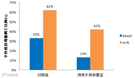 图二:中链脂肪酸(牛用抑菌宝)作为功能性饲料添加剂能限制中性线粒细胞凋亡的比重,表明其对免疫系统的积极影响