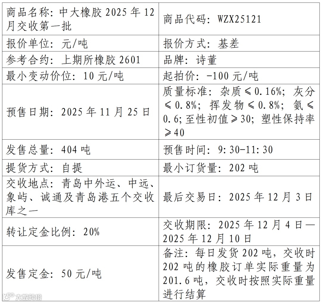 物产中大资本管理(浙江)有限公司定于2025年11月25日在产能预售系统中发售2025年12月交收第一批橡胶产品,具体信息如下: