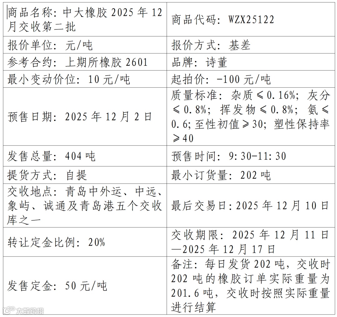 物产中大资本管理(浙江)有限公司定于2025年12月2日在产能预售系统中发售2025年12月交收第二批橡胶产品,具体信息如下: