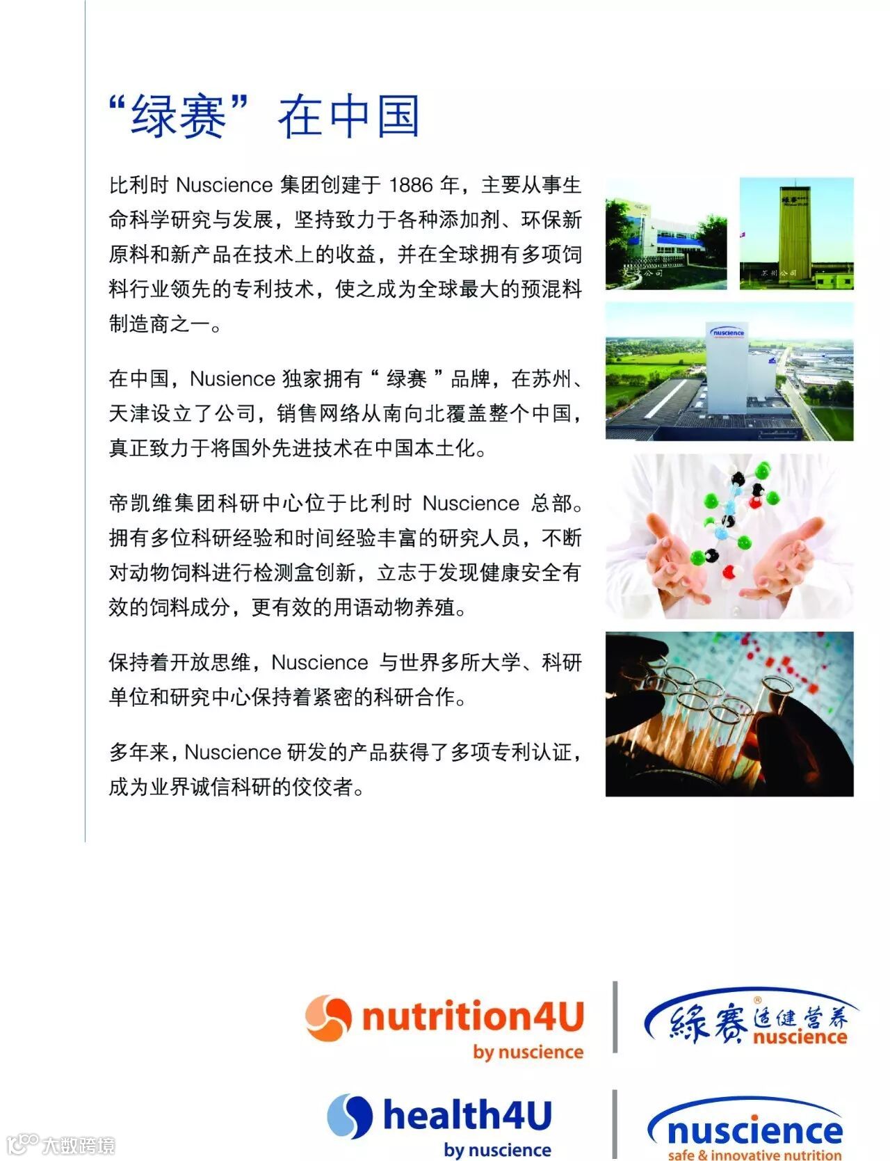 Nuscience在“动物生理学和市场需求”的指导下,提供动物营养方面的最新科学测试突破,结合“营养”和“科学”开发产品,减少了抗生素作为生长促进剂的需求,且有效优化原料。公司的创新承诺体现在其两大核心产品线上。Nutrition4U是为客户量身定制的维生素与矿物质预混物以及有助于促进年幼动物的营养吸收的蛋白质浓缩物。Health4U提供最先进的添加剂和功能性饲料成分,在改善家畜生长表现和整体表现方面发挥着重要作用。
