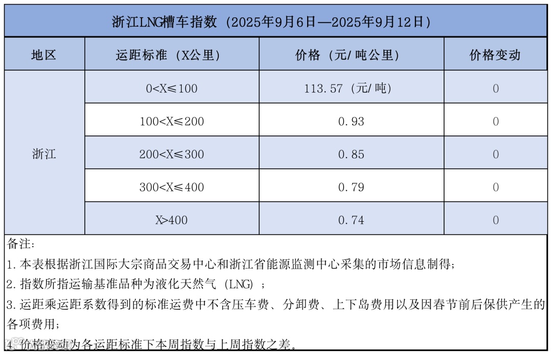 浙江液化天然气(LNG)槽车运费指数(2025年9月6日-2025年9月12日)