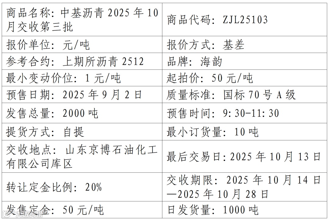 中基宁波集团股份有限公司定于2025年9月2日在产能预售系统中发售2025年10月交收第三批沥青产品,具体信息如下: