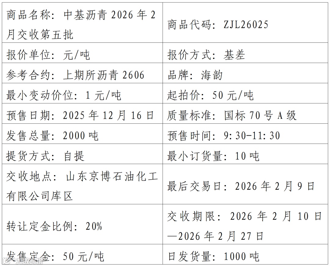 中基宁波集团股份有限公司定于2025年12月16日在产能预售系统中发售2026年2月交收第五批沥青产品,具体信息如下: