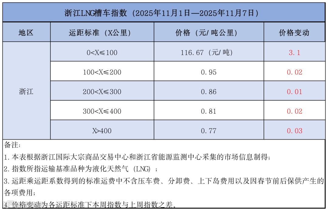 浙江液化天然气(LNG)槽车运费指数(2025年11月1日-2025年11月7日)
