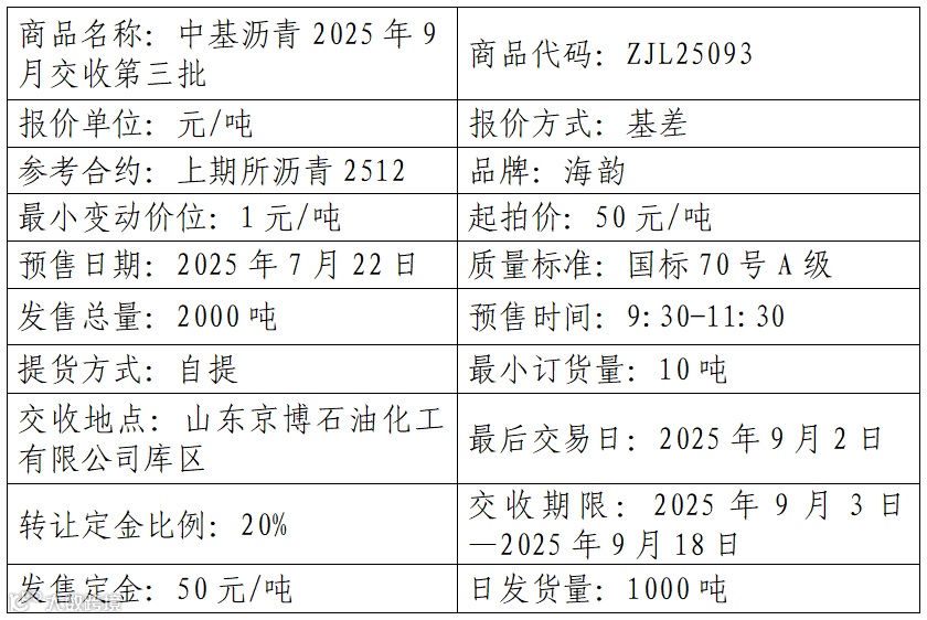 中基宁波集团股份有限公司定于2025年7月22日在产能预售系统中发售2025年9月交收第三批沥青产品,具体信息如下: