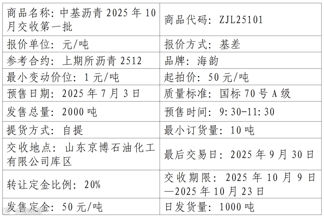 中基宁波集团股份有限公司定于2025年7月3日在产能预售系统中发售2025年10月交收第一批沥青产品,具体信息如下: