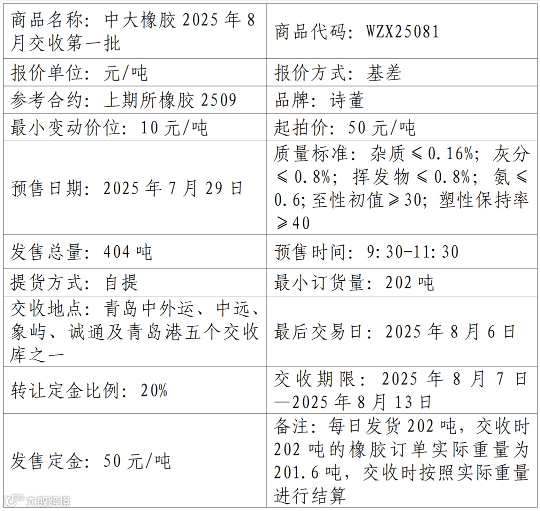物产中大资本管理(浙江)有限公司定于2025年7月29日在产能预售系统中发售2025年8月交收第一批橡胶产品,具体信息如下: