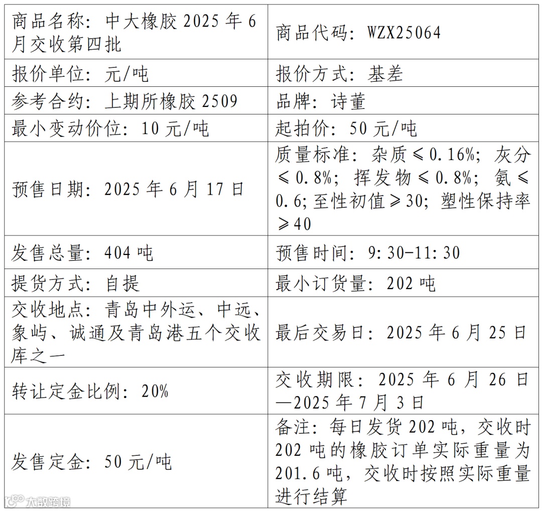 物产中大资本管理(浙江)有限公司定于2025年6月17日在产能预售系统中发售2025年6月交收第四批橡胶产品,具体信息如下: