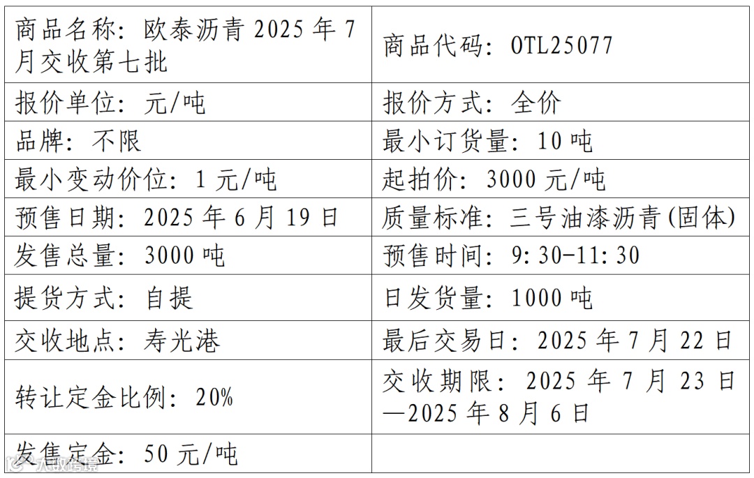 物产中大欧泰有限公司定于2025年6月19日在产能预售系统中发售2025年7月交收第七批沥青产品,具体信息如下: