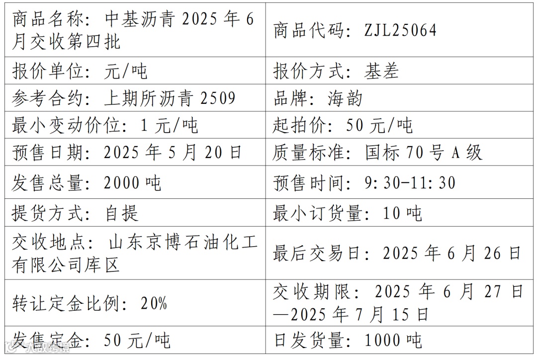 中基宁波集团股份有限公司定于2025年5月20日在产能预售系统中发售2025年6月交收第四批沥青产品,具体信息如下: