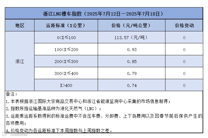 浙江液化天然气(LNG)槽车运费指数(2025年7月12日-2025年7月18日)