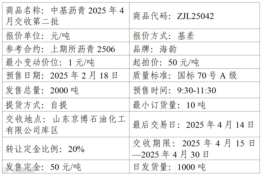 集团股份有限公司定于2025年2月18日在产能预售系统中发售2025年4月交收第二批沥青产品,具体信息如下: