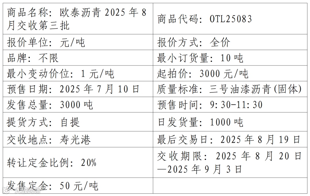 物产中大欧泰有限公司定于2025年7月10日在产能预售系统中发售2025年8月交收第三批沥青产品,具体信息如下: