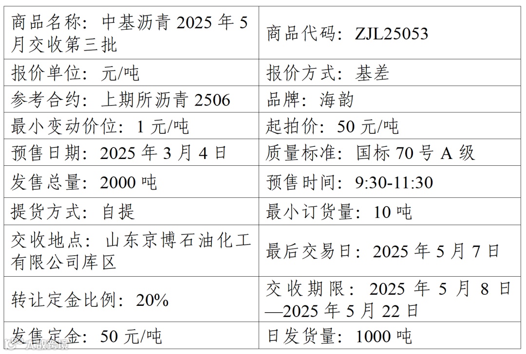 集团股份有限公司定于2025年3月4日在产能预售系统中发售2025年5月交收第三批沥青产品,具体信息如下: