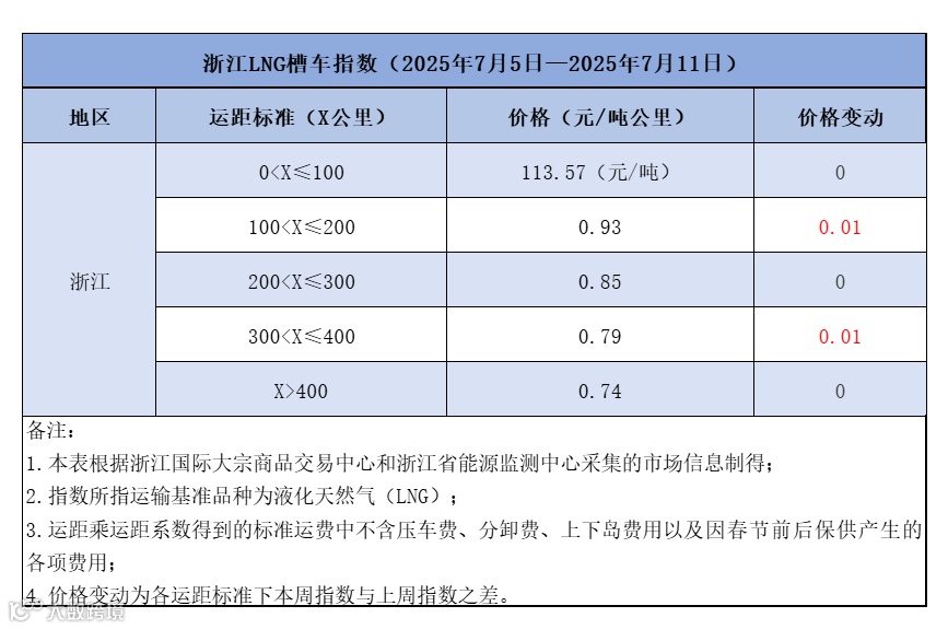 浙江液化天然气(LNG)槽车运费指数(2025年7月5日-2025年7月11日)