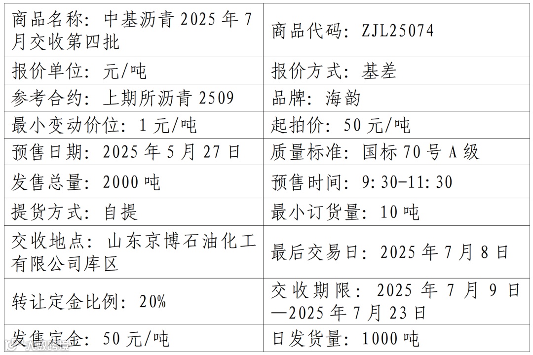 中基宁波集团股份有限公司定于2025年5月27日在产能预售系统中发售2025年7月交收第四批沥青产品,具体信息如下: