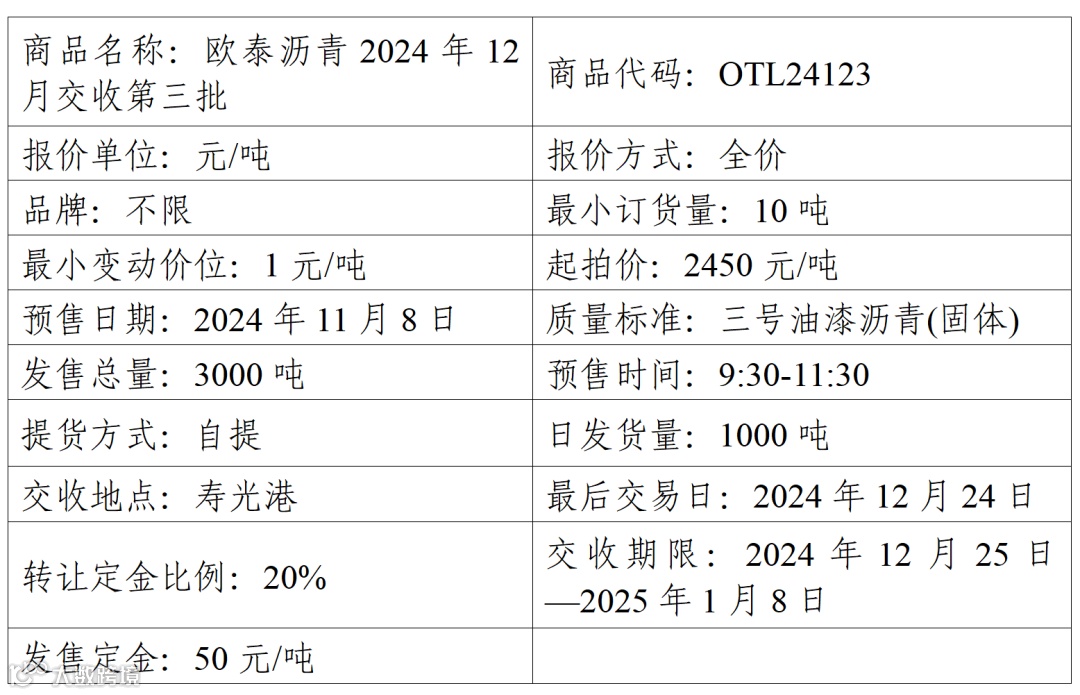 物产中大欧泰有限公司定于2024年11月8日在产能预售系统中发售2024年12月交收第三批沥青产品,具体信息如下: