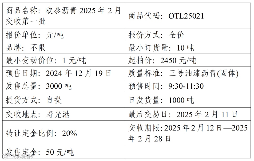 物产中大欧泰有限公司定于2024年12月19日在产能预售系统中发售2025年2月交收第一批沥青产品,具体信息如下: