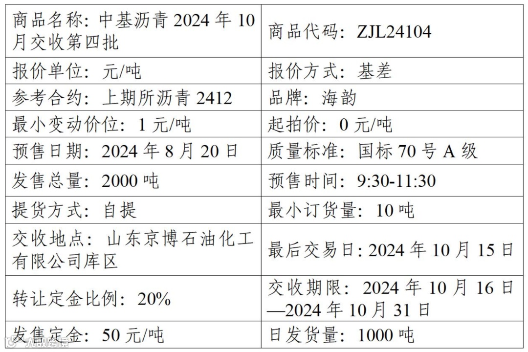 集团股份有限公司定于2024年8月20日在产能预售系统中发售2024年10月交收第四批沥青产品,具体信息如下: