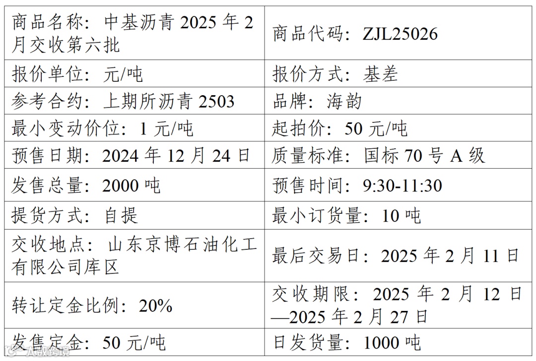 集团股份有限公司定于2024年12月24日在产能预售系统中发售2025年2月交收第六批沥青产品,具体信息如下: