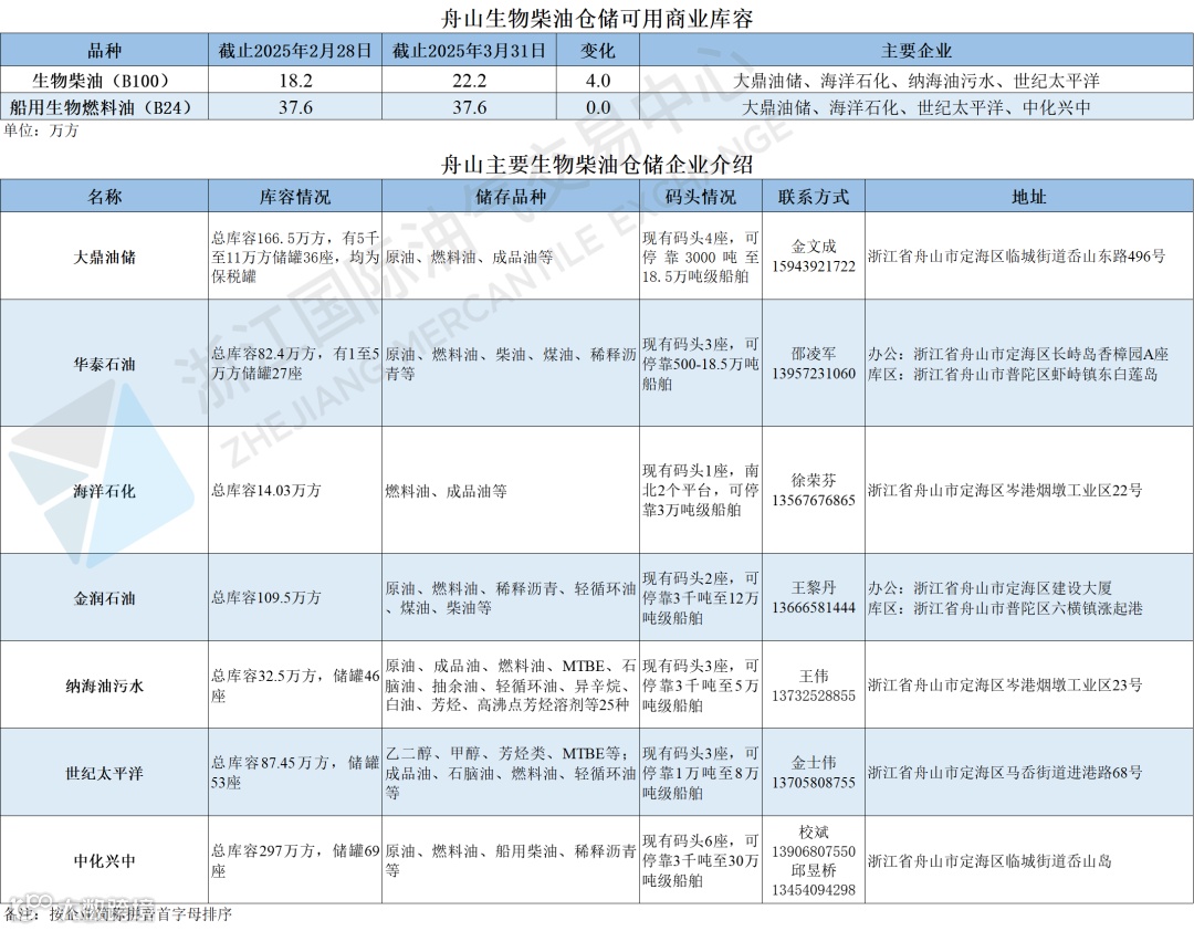 舟山生物柴油仓储可用商业库容