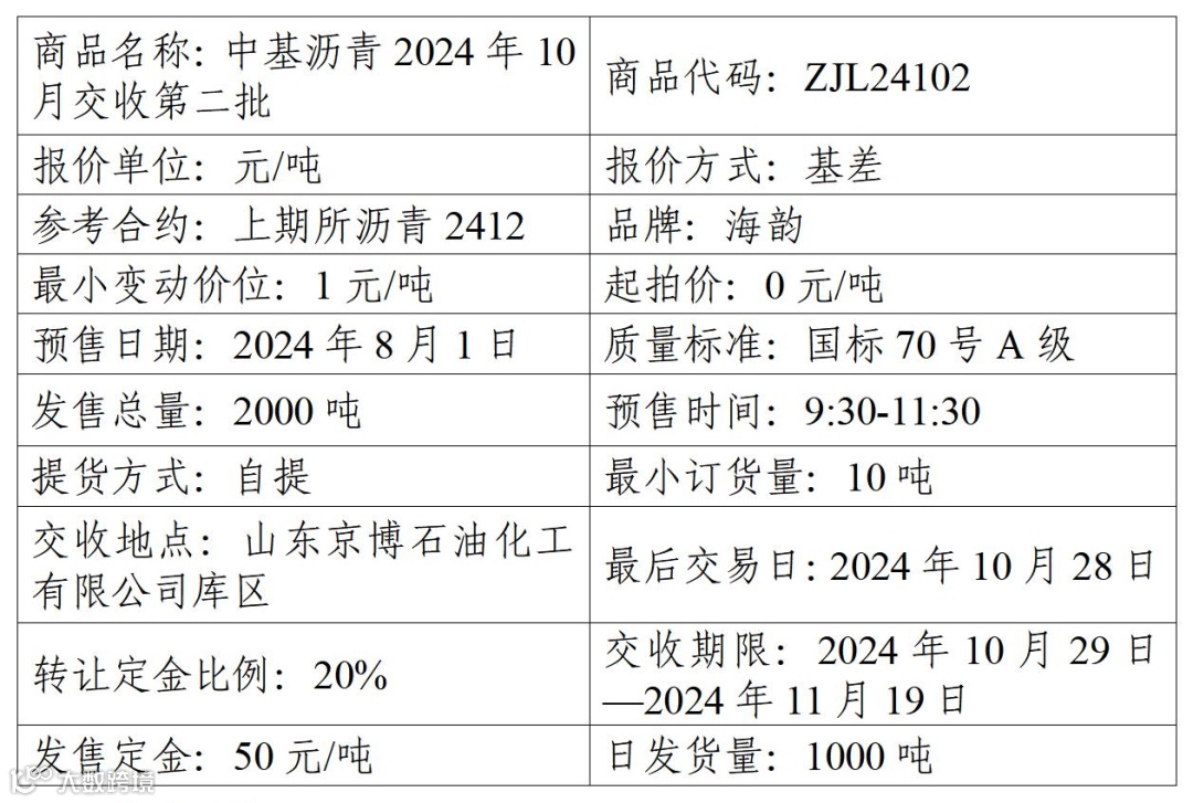 集团股份有限公司定于2024年8月1日在产能预售系统中发售2024年10月交收第二批沥青产品,具体信息如下: