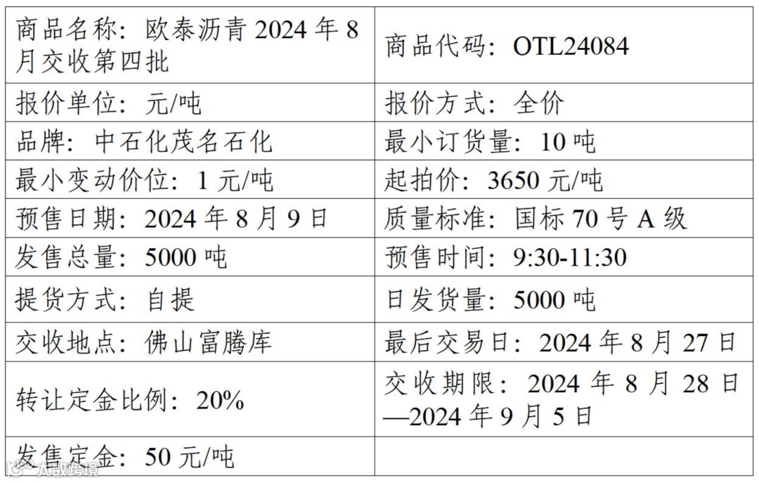 物产中大欧泰有限公司定于2024年8月9日在产能预售系统中发售2024年8月交收第四批沥青产品,具体信息如下: