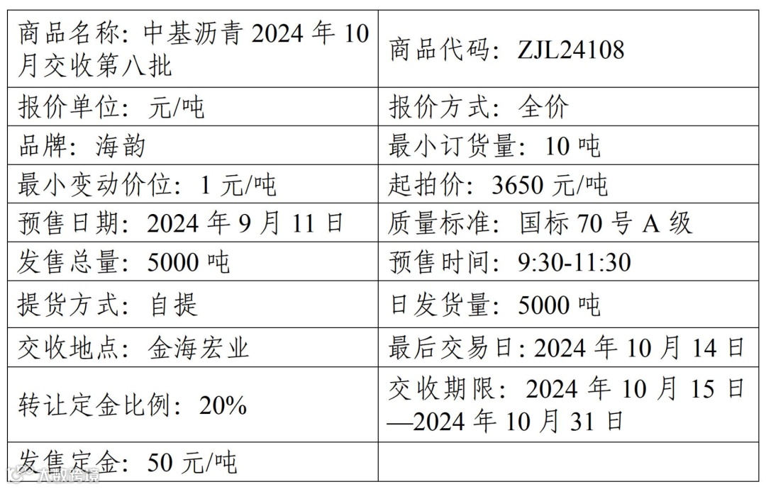 集团股份有限公司定于2024年9月11日在产能预售系统中发售2024年10月交收第八批沥青产品,具体信息如下: