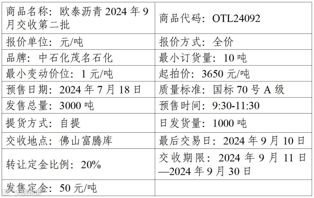 物产中大欧泰有限公司定于2024年7月18日在产能预售系统中发售2024年9月交收第二批沥青产品,具体信息如下: