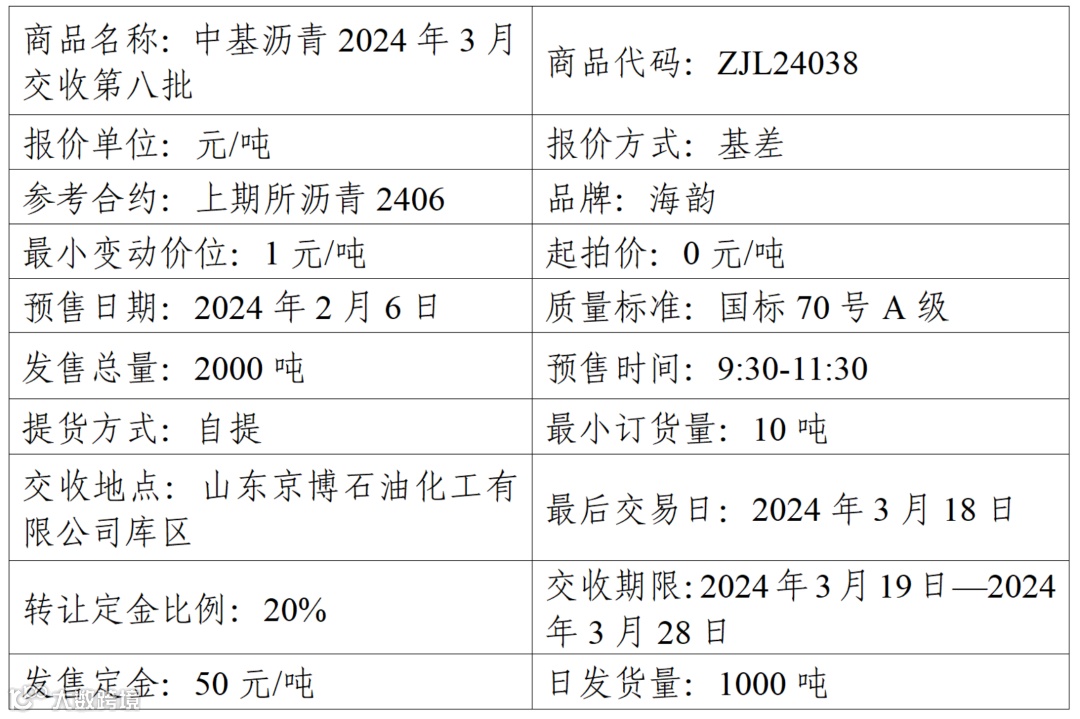 集团股份有限公司定于2024年2月6日在产能预售系统中发售2024年3月交收第八批沥青产品,具体信息如下: