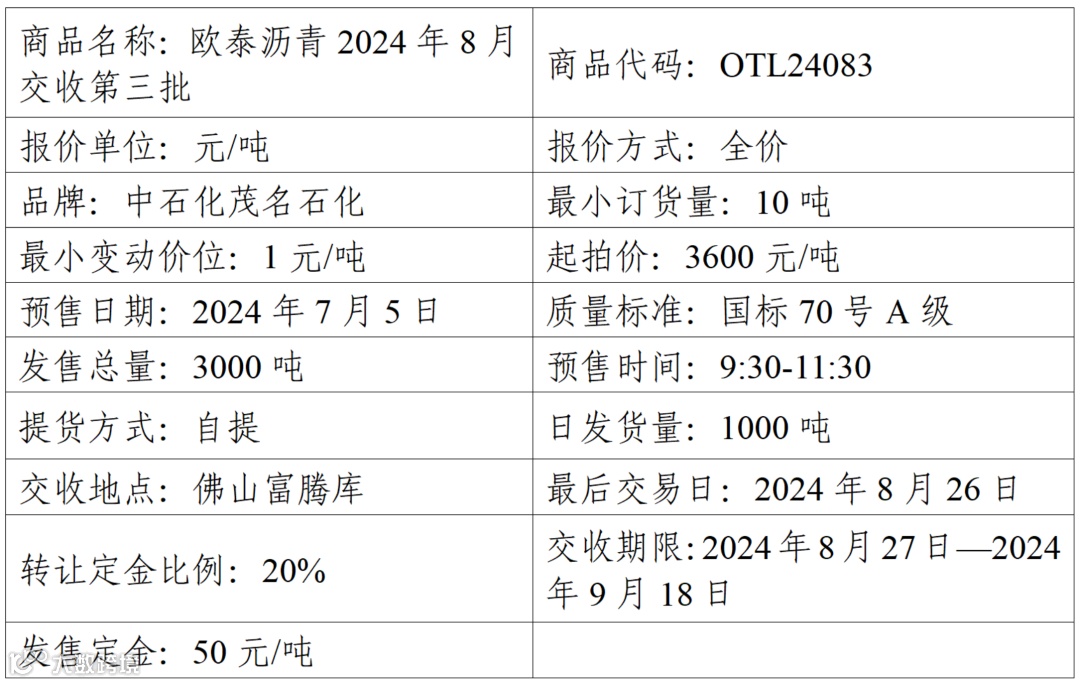 物产中大欧泰有限公司定于2024年7月5日在产能预售系统中发售2024年8月交收第三批沥青产品,具体信息如下: