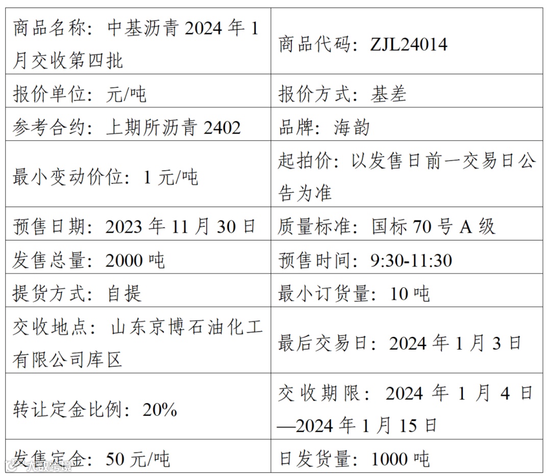 集团股份有限公司定于2023年11月30日在产能预售系统中发售2024年1月交收第四批沥青产品,具体信息如下: