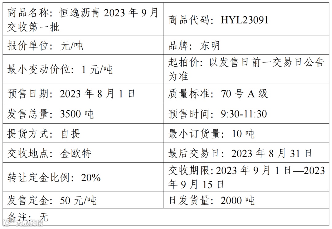 浙江恒逸国际贸易有限公司定于2023年8月1日在产能预售系统中发售2023年9月交收第一批沥青产品,具体信息如下: