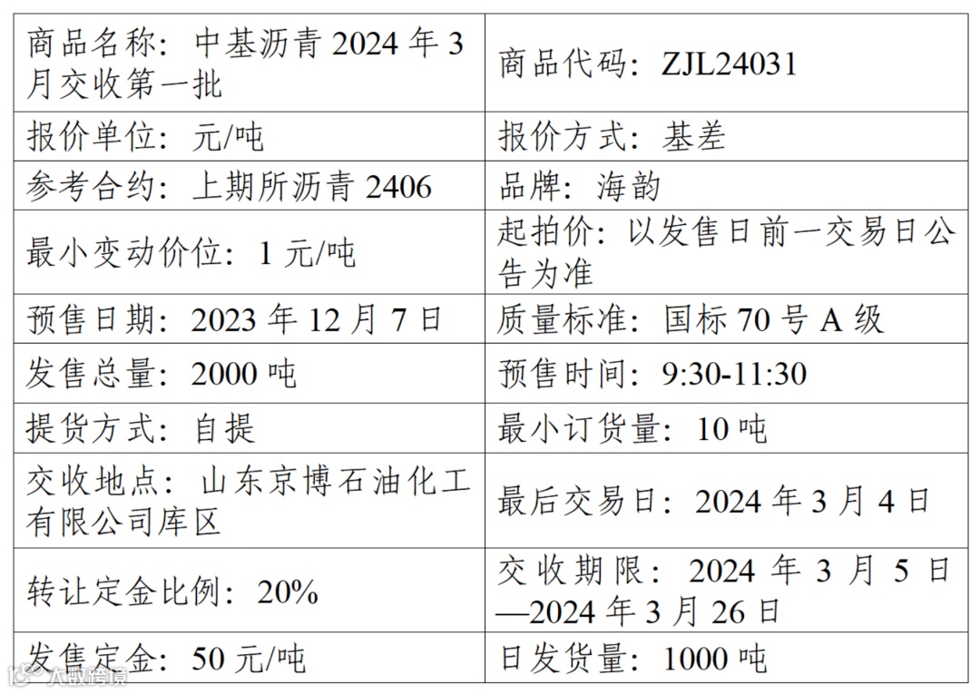 集团股份有限公司定于2023年12月7日在产能预售系统中发售2024年3月交收第一批沥青产品,具体信息如下: