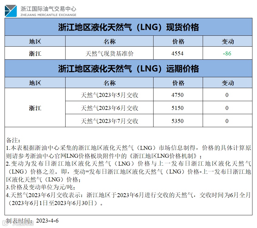【价格指数】浙江地区液化天然气(LNG)价格(20230406)