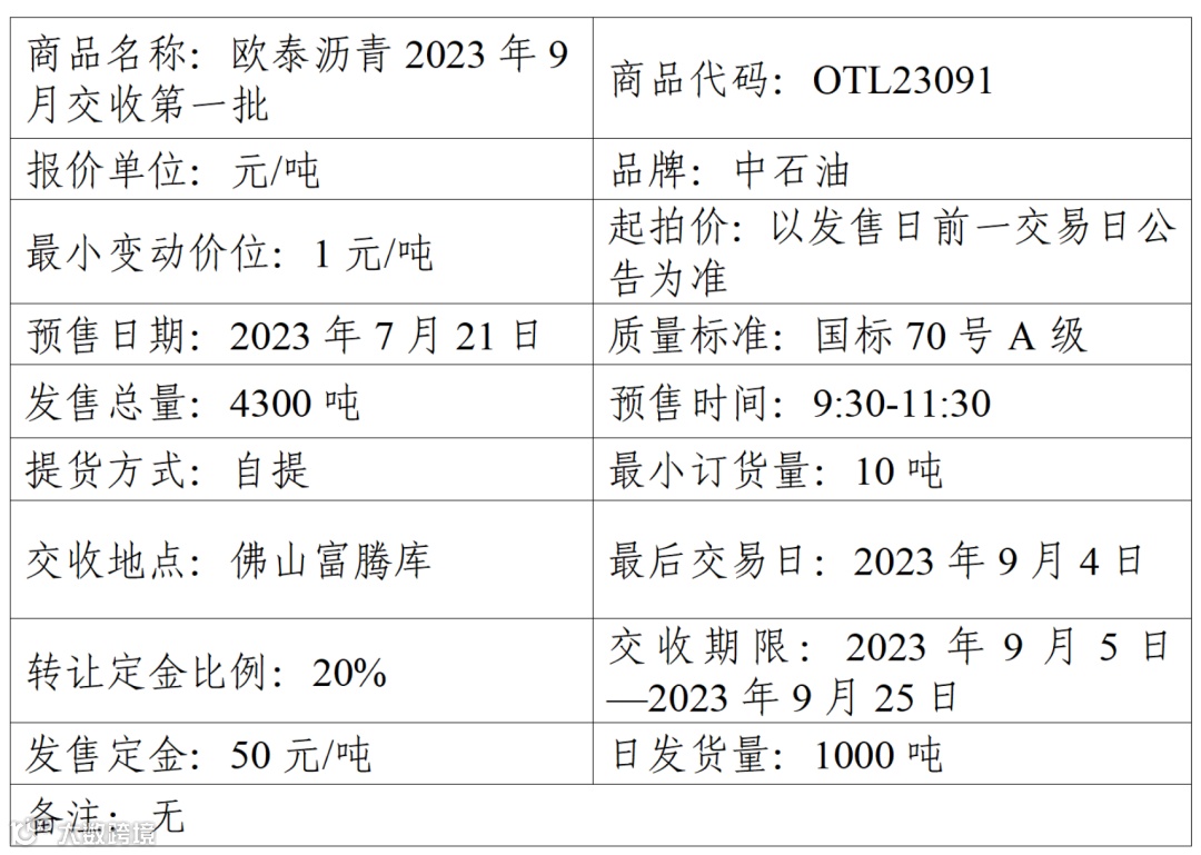 物产中大欧泰有限公司定于2023年7月21日在产能预售系统中发售2023年9月交收第一批沥青产品,具体信息如下: