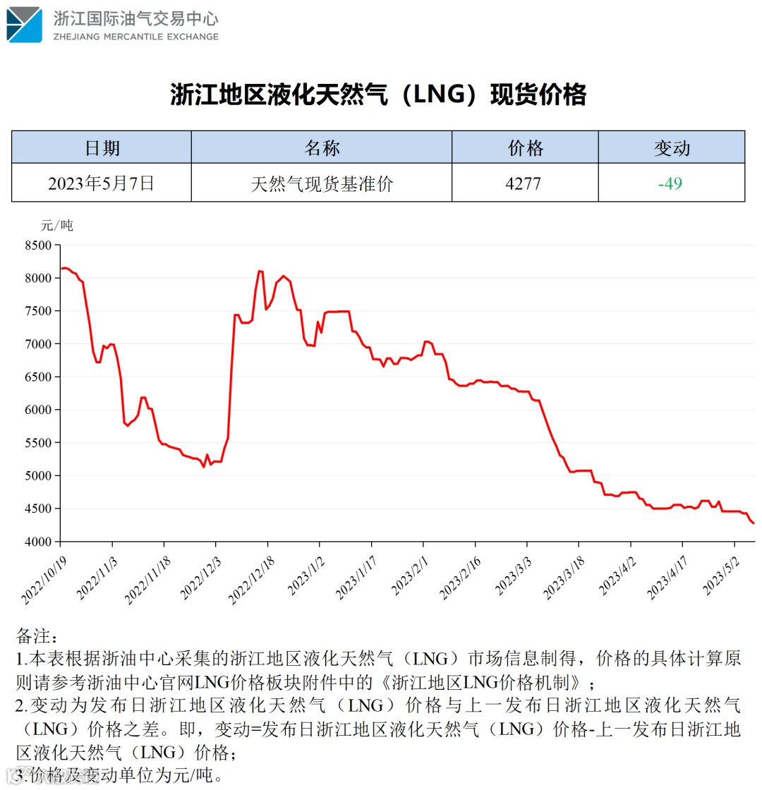 【价格指数】浙江地区液化天然气(LNG)价格(20230507)