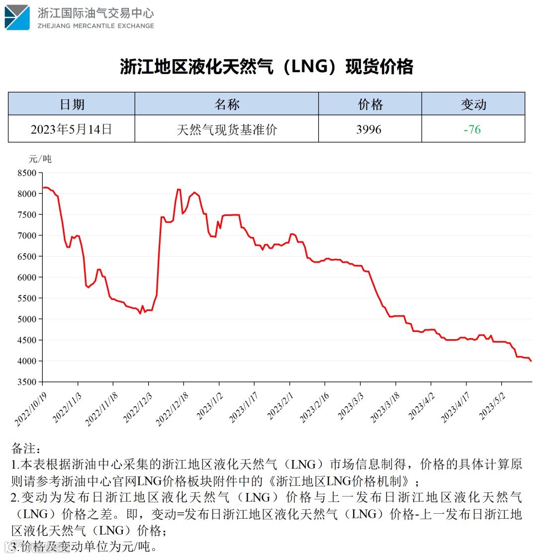 【价格指数】浙江地区液化天然气(LNG)价格(20230514)