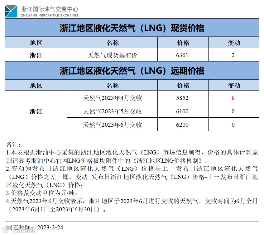 【价格指数】浙江地区液化天然气(LNG)价格(20230224)
