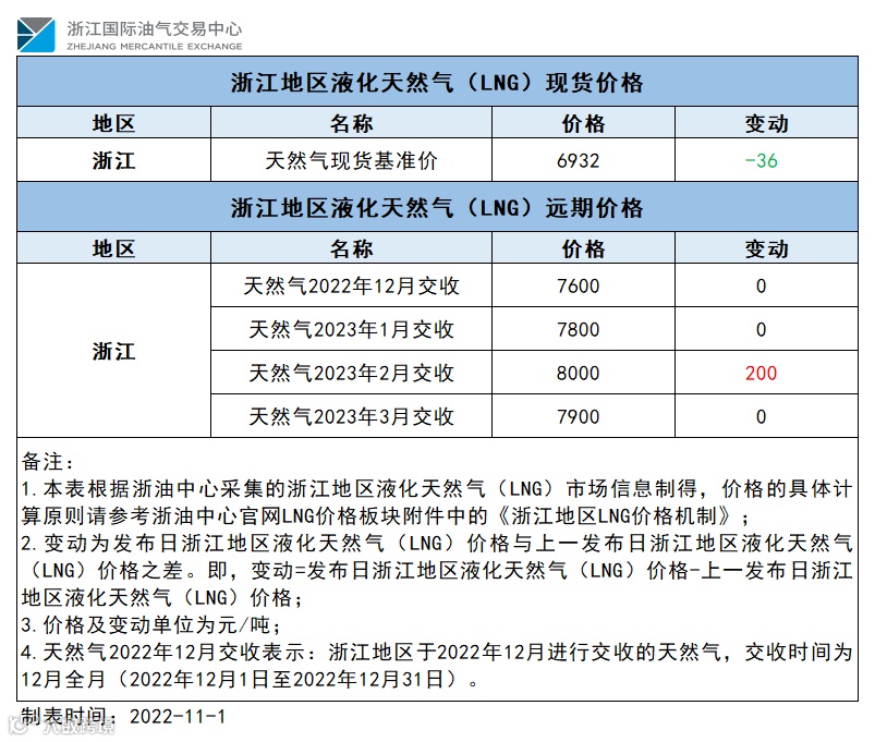 【价格指数】浙江地区液化天然气(LNG)价格(20221101)