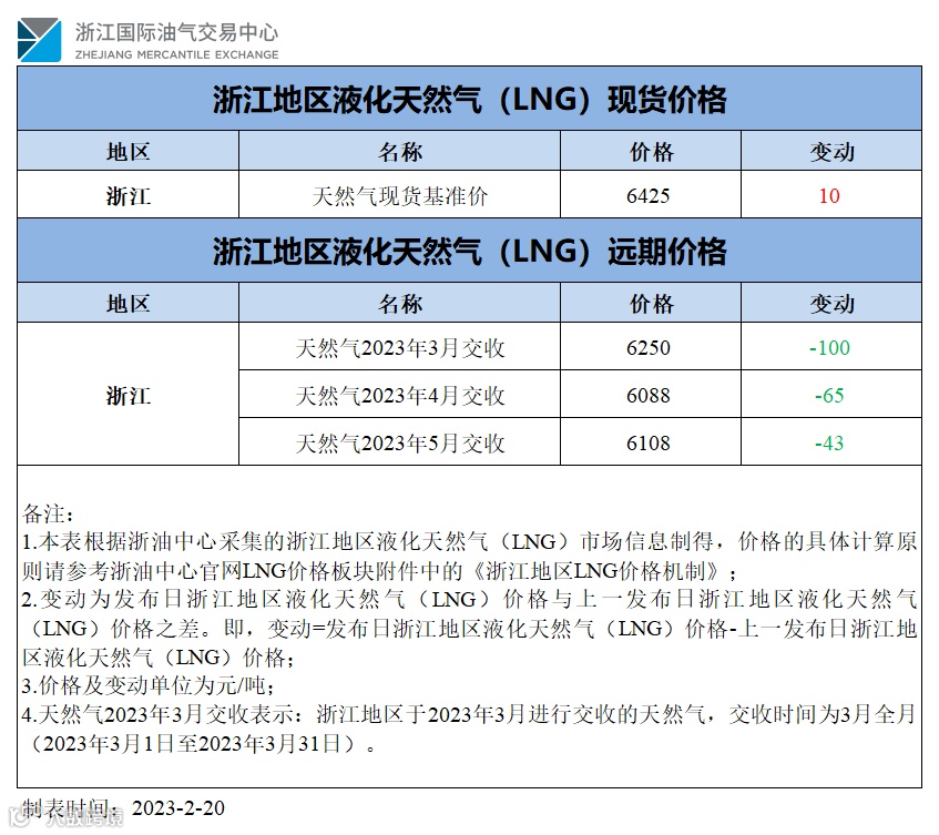 【价格指数】浙江地区液化天然气(LNG)价格(20230220)