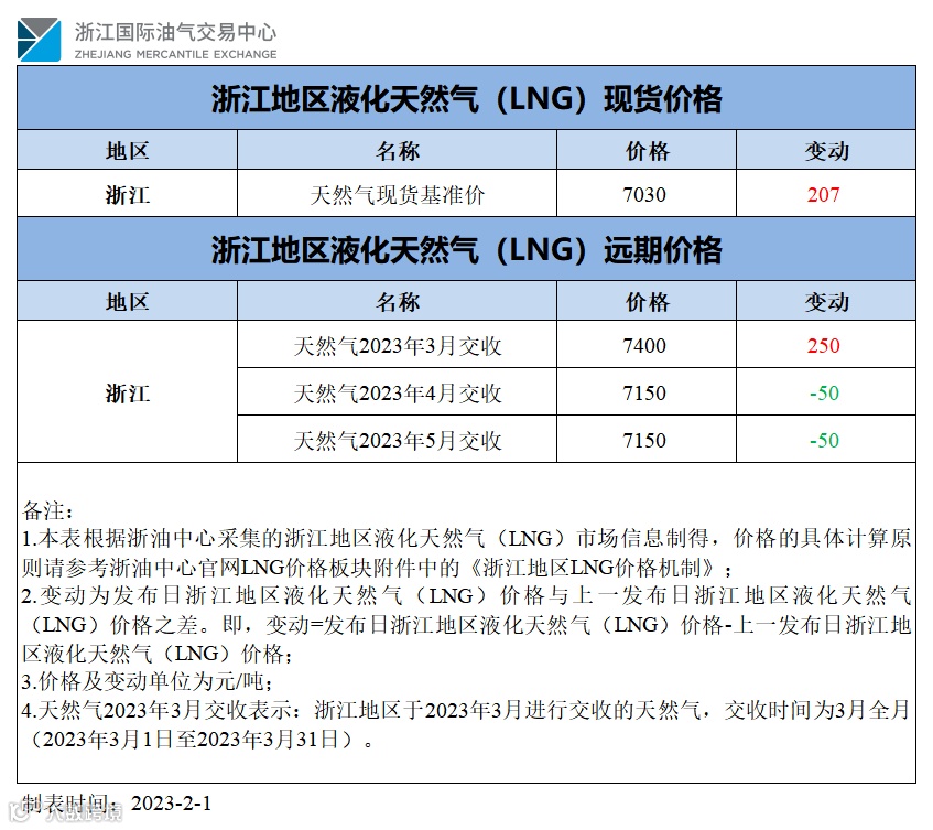【价格指数】浙江地区液化天然气(LNG)价格(20230201)