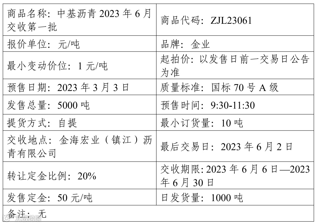 中基宁波集团股份有限公司定于2023年3月3日在产能预售系统中发售2023年6月交收第一批沥青产品,具体信息如下: