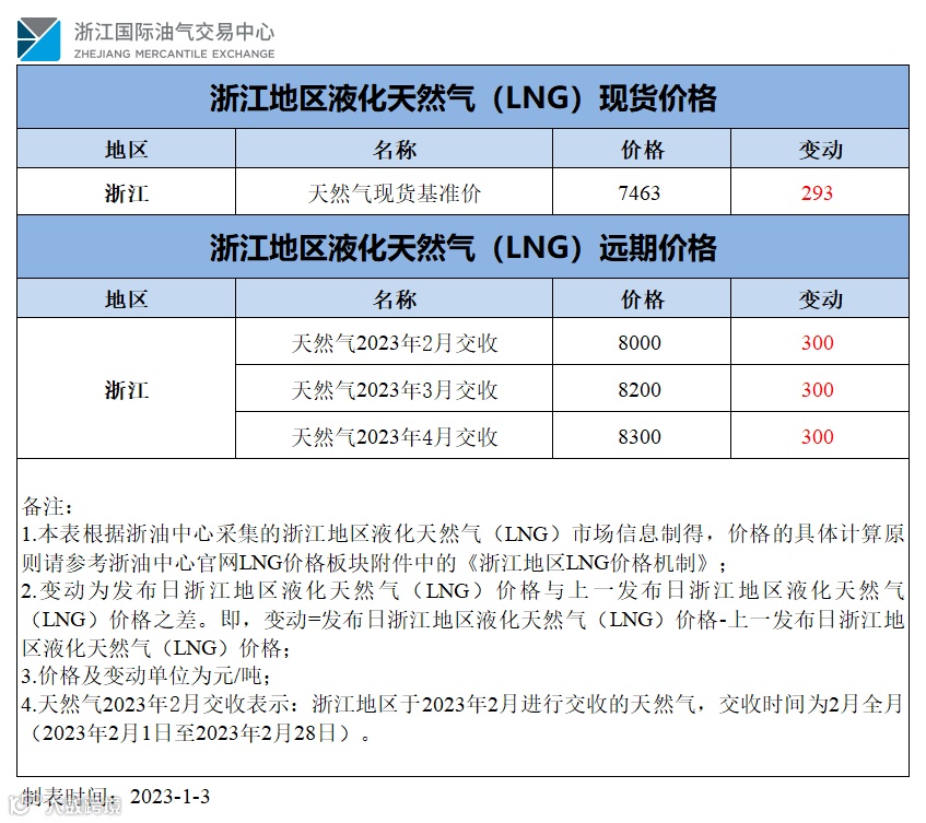 【价格指数】浙江地区液化天然气(LNG)价格(20230103)