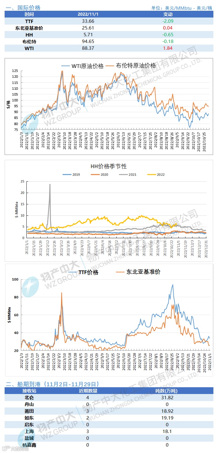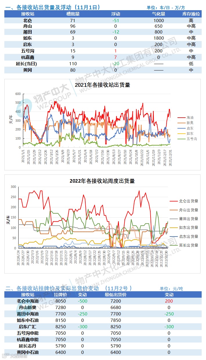 目前国内液厂总体开工维稳持平。近日国产气源价格连续下降挤占了一部分海气市场份额。华东地区接收站因窗口期出货减少,高价接收站价格大幅走跌,下游也无新增需求,叠加局部疫情影响,价格逐步下探。